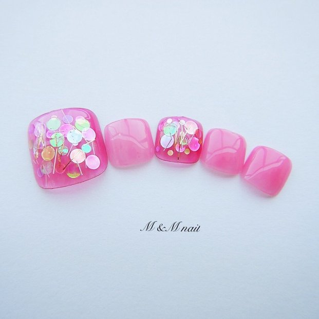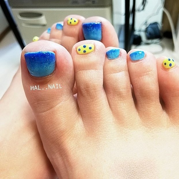 足元は人の目線から遠くにあるので、ハンドより目立たせるくらいが◎。グラデーションとイエロー×ブルーの夏らしい組み合わせが目を引きます。