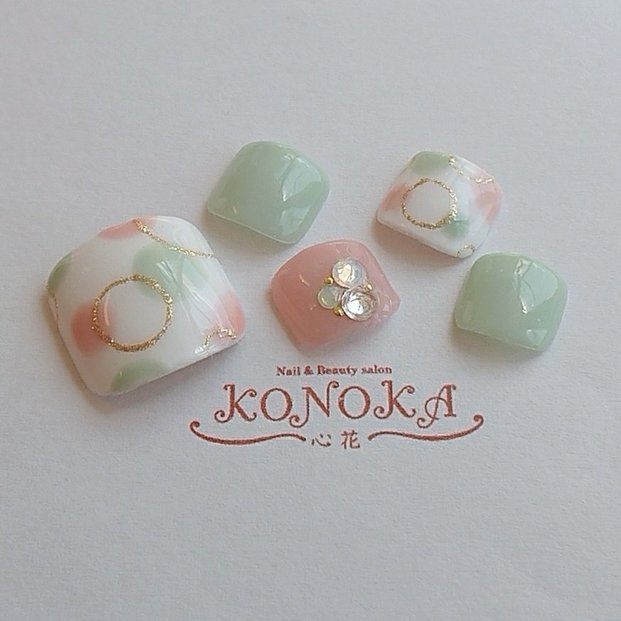 そこで今回は、人気サロンの水玉フットネイルをご紹介。自分では思いつかない色合わせや、パーツの使い方をぜひ参考にしてみてくださいね。