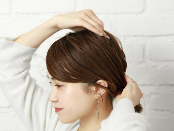サイドの毛束を少し引き出し、耳にかける