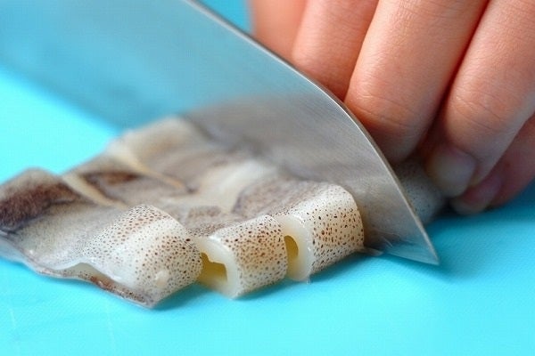 ・イカは足を引き抜き、目の際でワタを切り落とし、足の長さを切り揃えて2本ずつに切る。胴は中を水洗いし、幅1cmの輪切りにする。