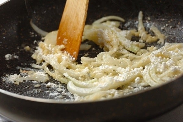 3、(2)のフライパンをキッチンペーパーでサッと拭き、バターを弱めの中火で熱し、ニンニク、玉ネギを炒める。玉ネギがしんなりしたら、さらに小麦粉を炒め合わせる。