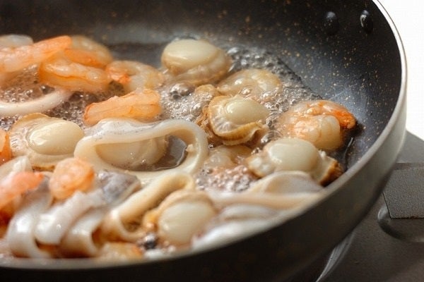 1、フライパンにむきエビとホタテ、イカ、白ワインを入れて中火にかけ、煮たったら蓋をして2~3分蒸し焼きにし、汁ごとボウルにいったん取り出す。