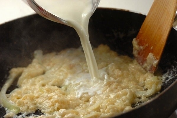 4、生クリームと合わせた牛乳を少しずつ加えながら混ぜ、トロミがついたら塩コショウで味を調える。