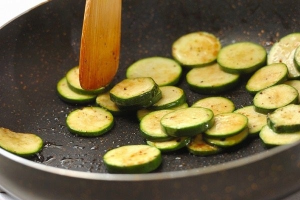 2、続けてオリーブ油を中火で熱し、ズッキーニを焼き色がつくまで焼き、(1)のボウルにいったん取り出す。