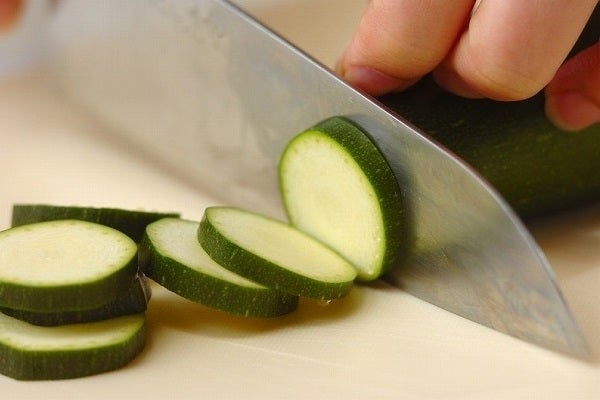 ・ズッキーニは両端を切り落とし、幅5mmの輪切りにする。分量外の塩少々をからめて少しおき、サッと水で洗って水気を拭く。