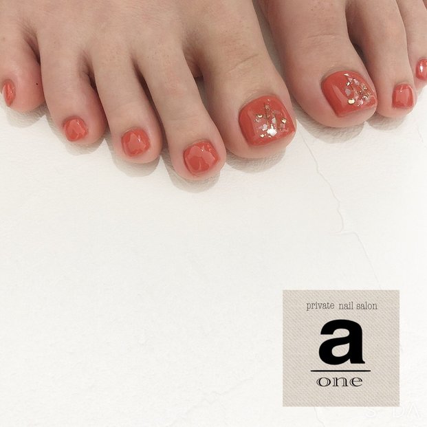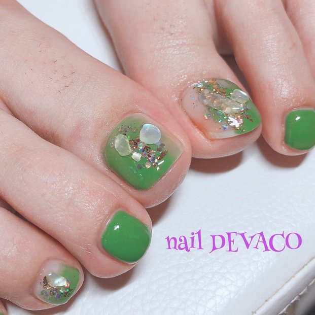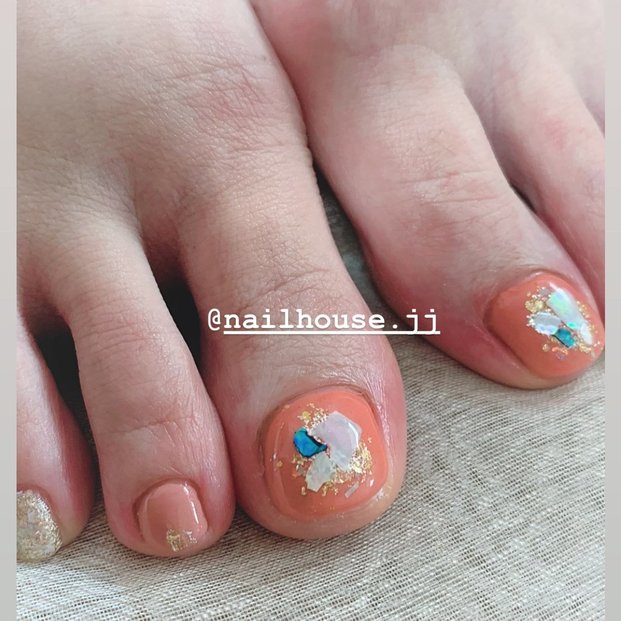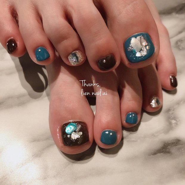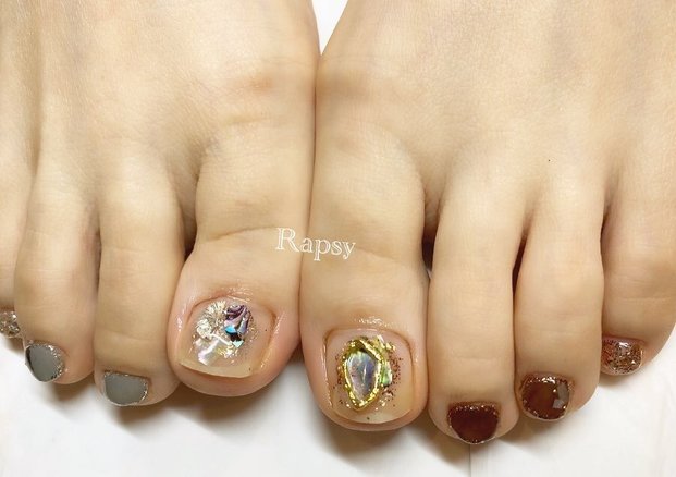 左右で異なるデザインを楽しむアシンメトリーネイルは、フットネイルにしてもオシャレ。一番目立つ親指に、それぞれグレイッシュカラーとラメのデザインをまとって。大きめのシェルパーツも今っぽい印象です。