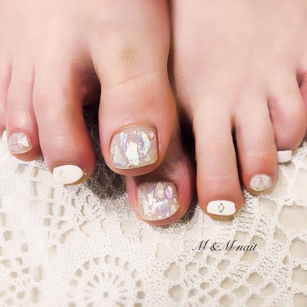 ホワイトのシェルを埋め込んだアートと、マットなホワイトネイルをコーディネート。夏らしく涼し気な足元が上品です♡ピュアなホワイトは夏映え必至のカラーですよ。