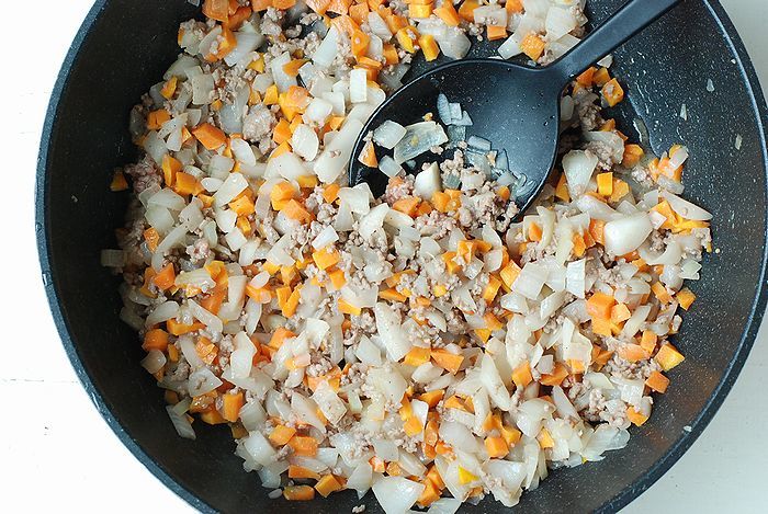 ② フライパンにサラダ油を熱し、みじん切りにした玉ねぎを炒めます。玉ねぎがしんなりしたらひき肉、人参の順に加え更に炒めます。