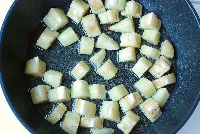 ② フライパンに多めのサラダ油を熱し茄子を皮目を下にして揚げ焼きし火が通ったら一旦取り出して油をきります。