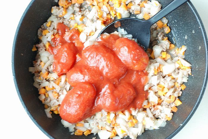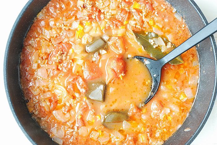 ③ トマト缶と水、ベイリーフを加え鍋の蓋をして中弱火で10分煮込みます