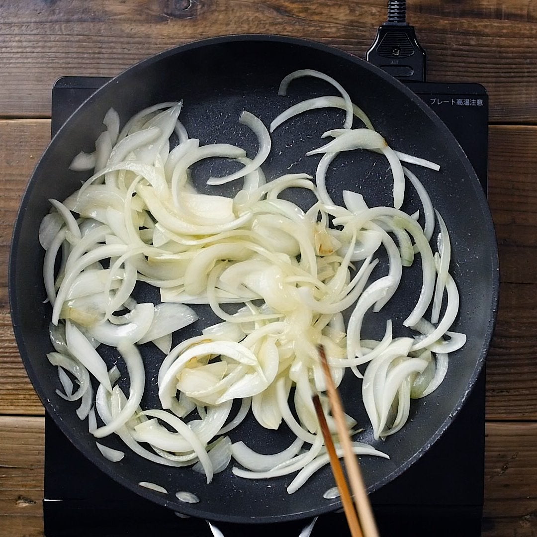 同じフライパンにオリーブオイルを引き、玉ねぎを弱火でしんなりするまで炒めます。