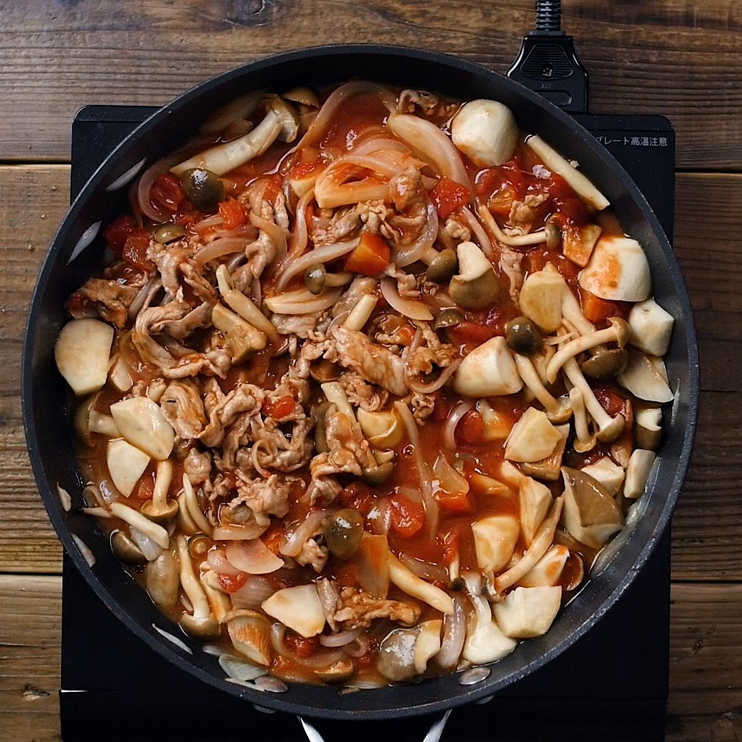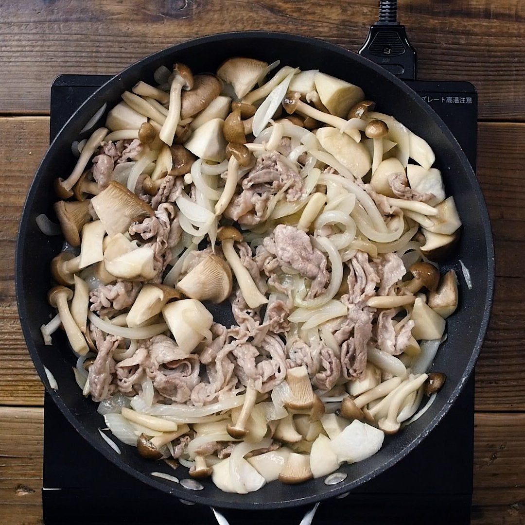 ・きのこを加えてからは、強火で焦げないように混ぜながら炒めてください。・豚肉に小麦粉をまぶすことで、肉が縮まずやわらかく仕上がります。