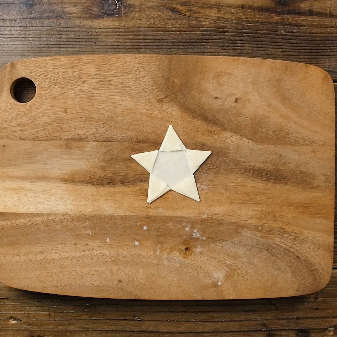 餃子の皮は5箇所切り込みを入れます。皮の縁に水をつけて内側に折りたたみ、星の形にします。