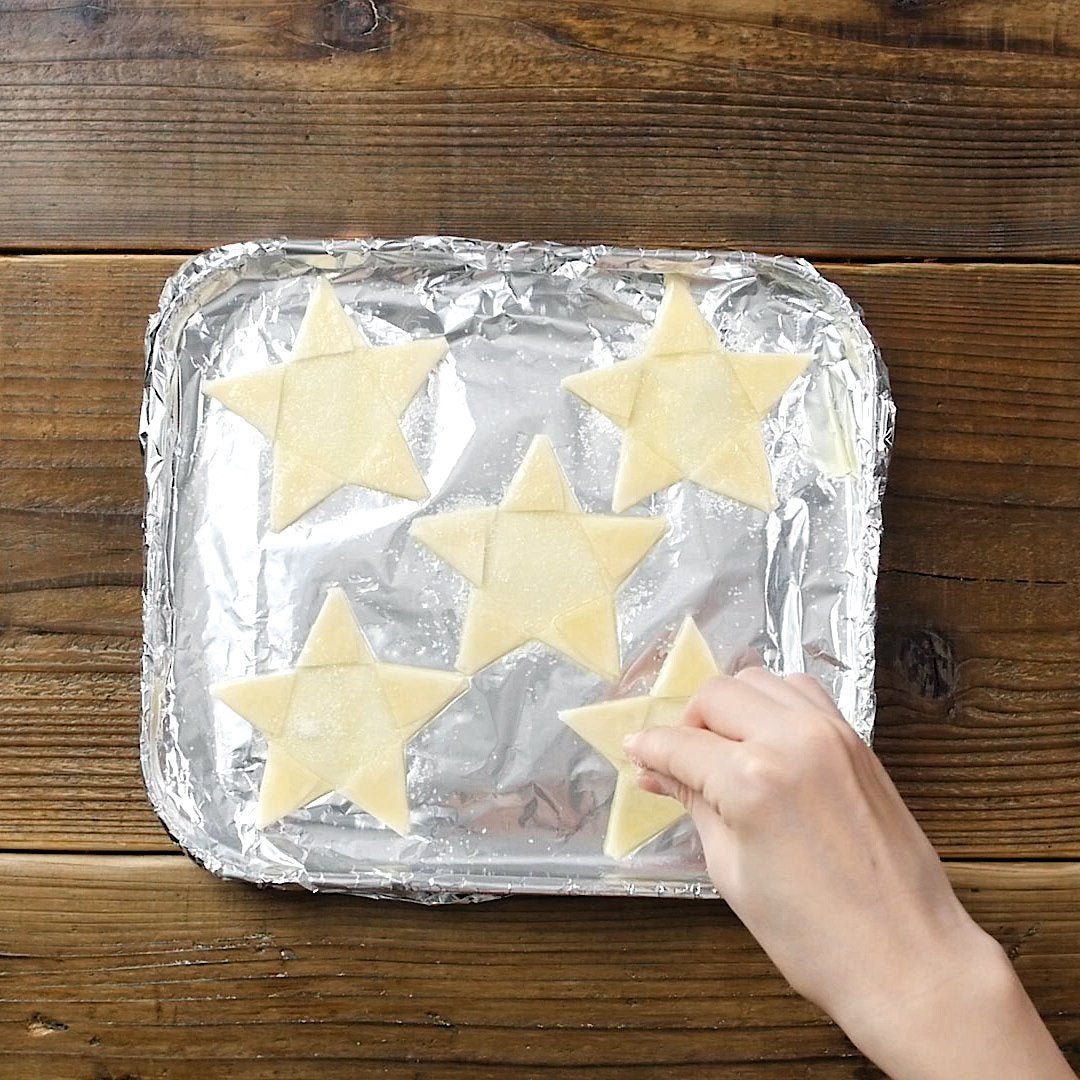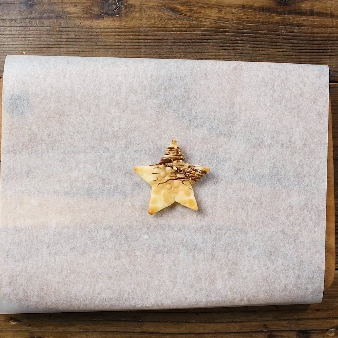 ・餃子の皮 … 5枚・バター(無塩) … 10g・グラニュー糖 … 小さじ2杯トッピング・ミルクチョコレート … 10g・ホワイトチョコレート … 10g・アーモンドダイス … 適量・デコレーションシュガー … 適量【下ごしらえ】お星さまラスク