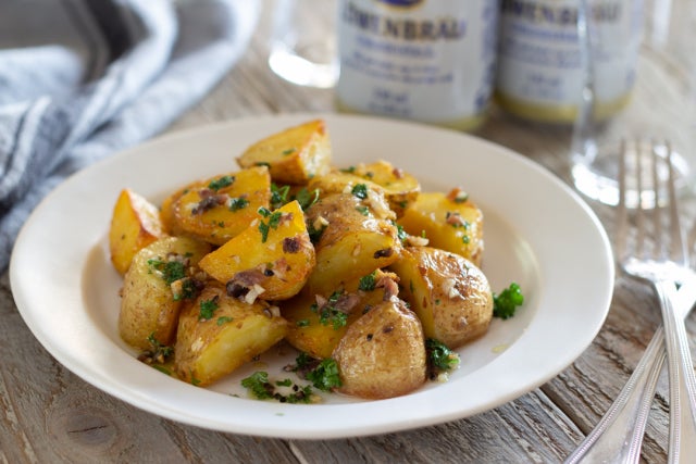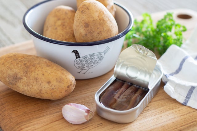 まずは定番、アンチョビポテト。アンチョビの塩気と、多めに入れたにんにくの風味に食欲がそそられます。ひと手間かかりますが、じゃがいもを揚げ焼きにすると外側がカリカリで中がほっくりとおいしく仕上がります。