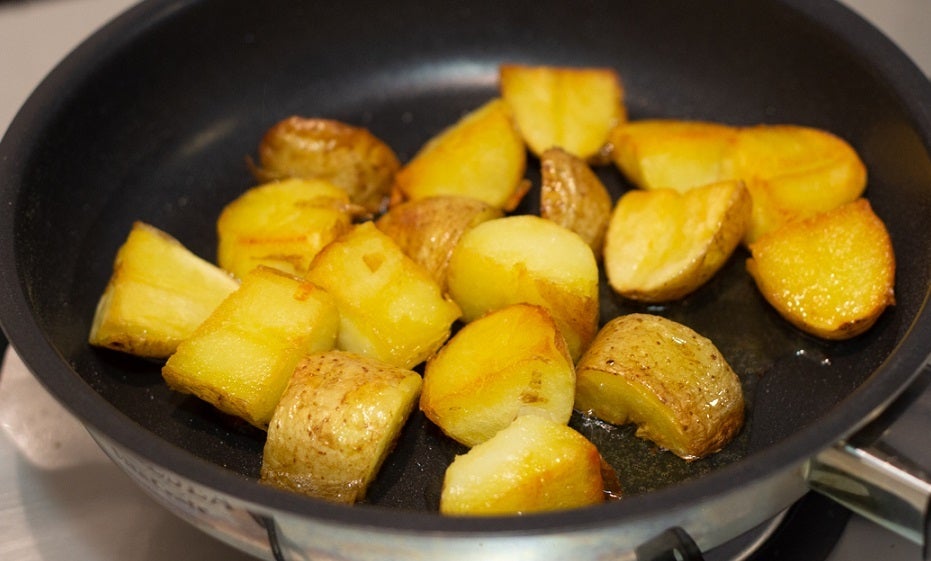 ④ フライパンにオリーブオイル、じゃがいもを入れて火にかける。あまり動かさずじっくり加熱し、カリっとするまで弱めの火加減で揚げ焼きにする。きつね色になったら、じゃがいもを取り出す。