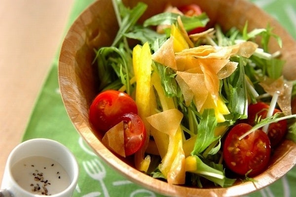 シャキシャキ食感の水菜に、プチトマトやパプリカを添えて、揚げたワンタンの皮を乗せれば完成の「水菜のカリカリサラダ」は、彩りも美しく、水菜のシャキシャキとワンタンの皮のパリパリなど各素材の食感も楽しめる一品です。