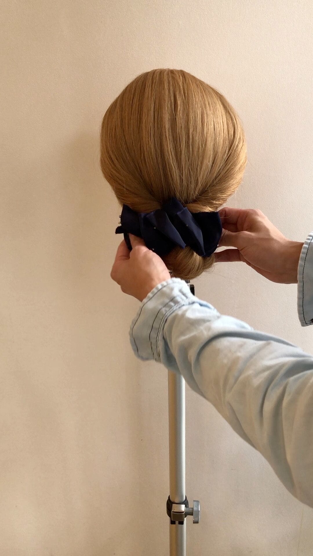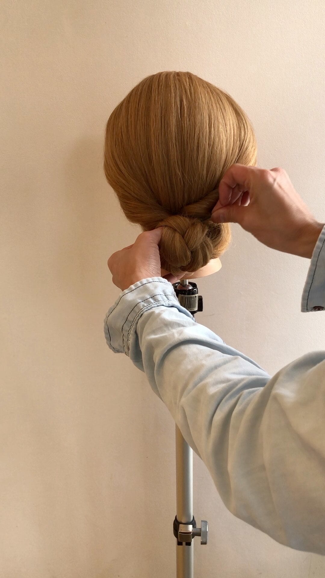 ③毛先まで三つ編みしたら、毛先を持ったまま内側にくるくると丸めて頭にくっつけます。(丸め始めはなるべく細かく丸めて小さくなるようにすすめていくと後で崩れにくいです。)