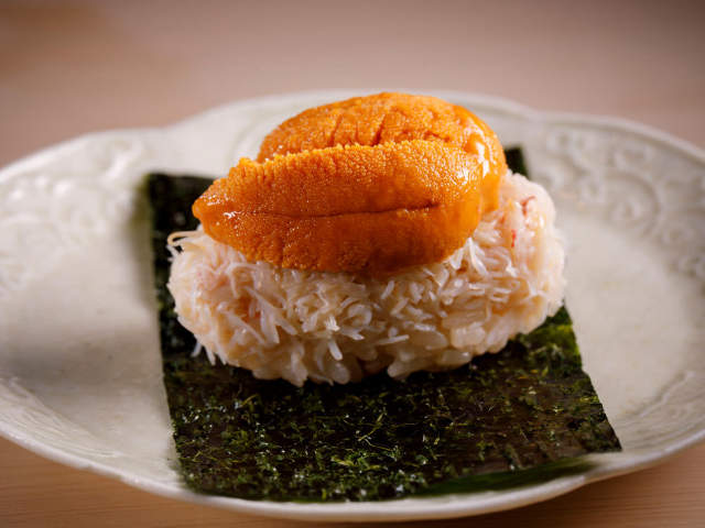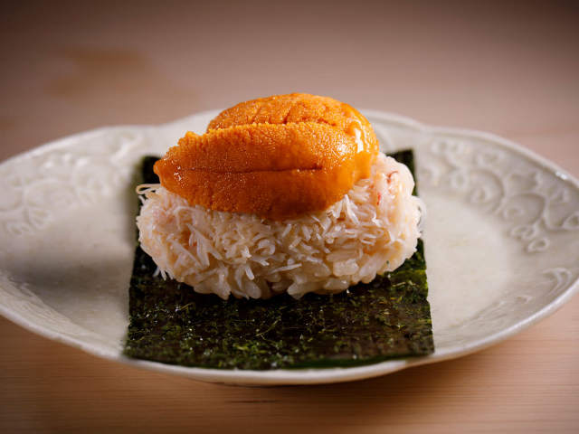 頬張るとまずウニが味わえ、次に海苔の香りを感じる。青海苔入りの佐賀産の有明海苔「こんとび」は、その後に訪れる毛ガニと酢飯を見事に昇華させる。見た目を遥かに凌ぐおいしさで2品目にして完全に胃袋を掴まれてしまう。