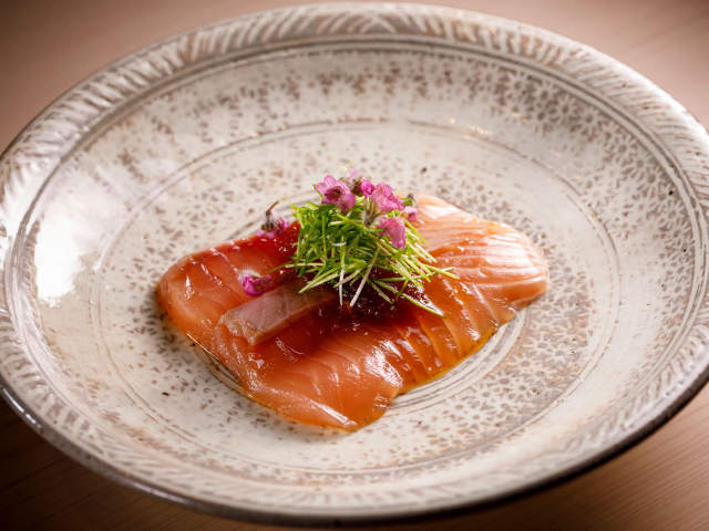 3品目からはつまみが続く。「桜鱒 玉葱醤油」(写真上)は、藁で軽く燻した桜鱒の皮目だけを焼き、すりおろした玉ネギで作った醤油をかけ、芽ネギとシソの花をのせている。ねっとりとした食感の桜鱒は口に入れた瞬間からとろけてしまうが、後を追うように玉ネギ醤油のうまみが喉を潤す。“走り”の桜鱒はこれからますます脂がのって赤みを増し、5月いっぱいまで楽しめるそうだ。