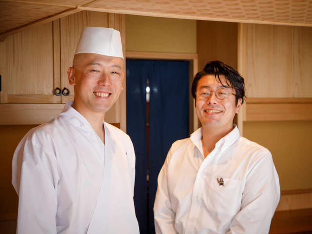 さらに、ペアリングも同じ鮪と同じ酒なのに違ったアプローチがあるのだと言う。「マグロは酸味が特徴的なので合わせるお酒は寄り添うような酸味が欲しいんです。ですから酸味が強い赤身には冷酒でキリッと酸が立つようにし、トロには燗冷ましで乳酸を立たせてミルキーでとろける感じを作ります」と話すのは“鼻につくソムリエ”の異名を取る保坂卓さん(写真下・右)。もともとフラワーデザイナーだったが、人が喜ぶ姿を自己の喜びと思い、お客との距離がより近い飲食サービスに転職したという珍しい経歴の持ち主だ。