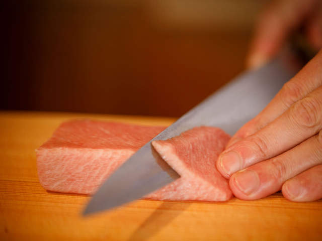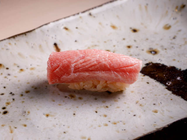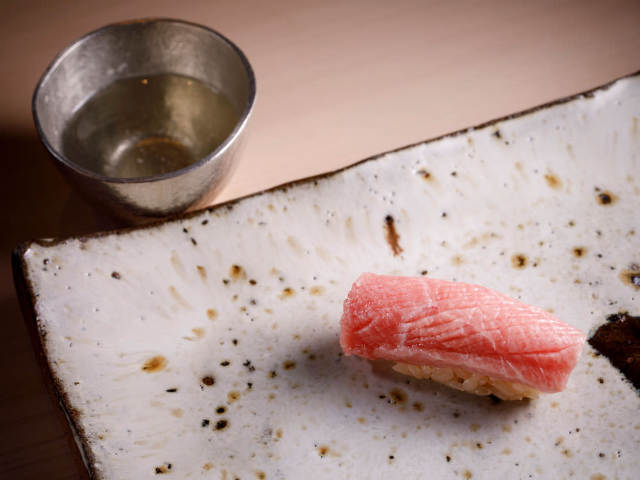 岡田さんはここで必ず酢飯の温度を変える。赤身にはほんのりまだ温もりのある酢飯、トロには炊きたての酢飯を使う。温度の違いと酢の働きで、それぞれの脂が酢飯に馴染み、“とろける”のである。
