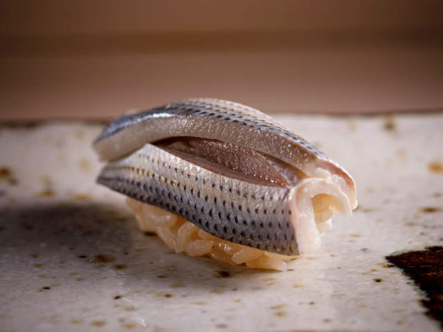 岡田さんは18歳で何の気なしに鮨の世界に入ってしまったせいか、このあまりにも地道な仕事に8年間頑張ってみたものの華やかな日本料理に憧れてしまい5年離れたことがある。しかしカウンターでお客の反応を直接感じられる鮨の世界がやっぱり好きなのだと鮨の道に戻った。その時の修業先の親方から徹底的に教わったのが地道な仕事である江戸前の技法で、今や岡田さんの得意とする「小肌」(写真下)もその親方譲り。
