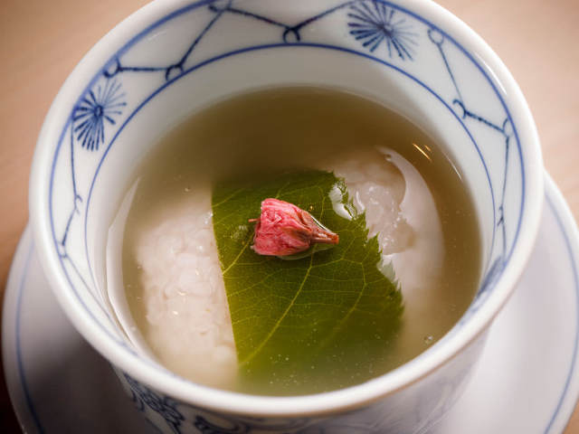 まずは「のどぐろのさくら蒸し」(写真上)。こちらでは胃を温めるために必ず温かいものから始める。蓋を取ると閉じ込められていた桜の香りがふんわりと漂う。酒蒸ししたノドグロを道明寺粉でくるみ、桜の葉と花を飾る。その上から生姜をきかせた銀餡を流し入れた春らしさをいっぱいに感じるひと品。
