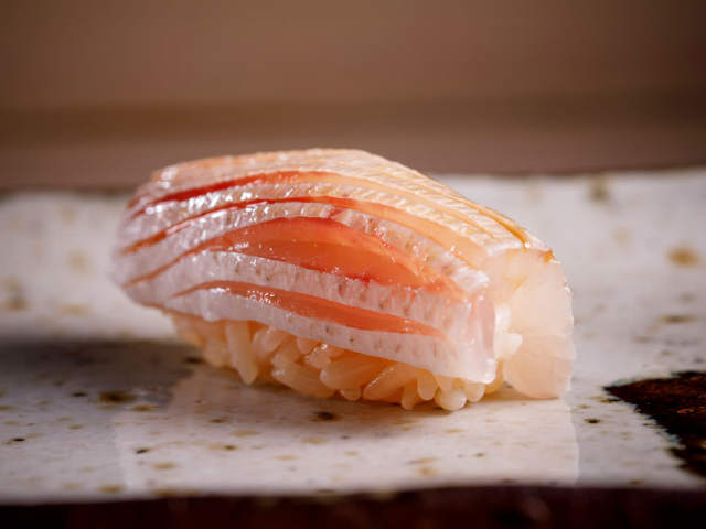 つまみが5〜6品でた後で握りとなる。本日は「春日鯛 昆布締め」(写真上)から。昆布のねっとり感を抑えながら香りと身が締まりつつもやわらかさが際立つ。カスゴ鯛、酢飯、煮切りの三位一体が隙のない最強のマッチングで、しみじみおいしいと目を細めてしまう。