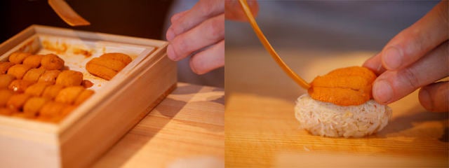 空腹に沁み入ったところで次はシグネチャーである「毛蟹 雲丹海苔巻き」(写真上)の登場だ。毛ガニの握りの上に身が厚くぷっくりとしたウニをのせ海苔巻きにしたインパクトこの上ない逸品。このビジュアルに誰しもが写真を撮ってしまう。「試作の段階では毛ガニとウニがぶつかるかもと思ったが実際に食べてみると勝負できる握りになった」と岡田さん。