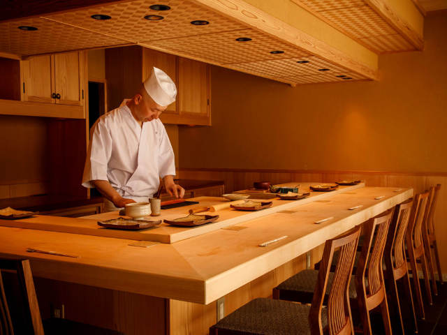 檜や椋の自然の質感と色味を大切にした設えはどこか懐かしさを覚え、直接当たらないように配慮された照明もリラックスできる。高級鮨店であることを忘れさせてくれる居心地の良さがここにはある。