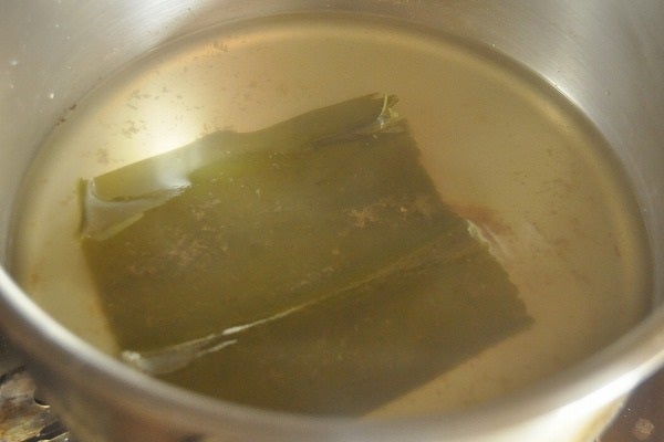 1、小鍋にだし汁と昆布を入れて中火にかける。煮たったら昆布を取り出し、塩で強めに味を調える。昆布はとっておく。