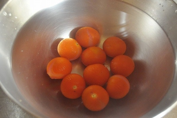2、鍋に湯を沸かし、プチトマトを入れて火を止める。取り出して冷水に放ち、粗熱が取れたら湯むきする。皮はとっておく。