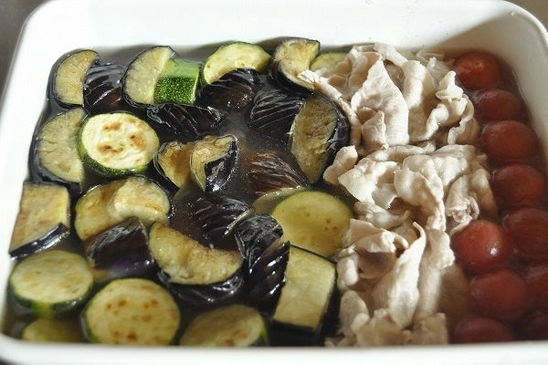 5、ナス、ズッキーニ、プチトマト、豚肉を(1)の汁に浸し、1時間以上置いて味を含ませ、器に盛り合わせる。