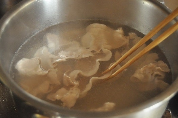 3、(2)の鍋を再び火にかけ、煮たったら火を止めて豚肉を一枚ずつ広げながら入れてしゃぶしゃぶと火を通す。赤身が残ったら再び鍋を火にかけて火を通し、冷水に放ち、水気を絞る。長ければ食べやすい長さに切る。