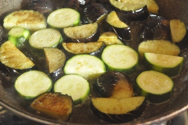 4、フライパンにサラダ油を多めに入れて中火にかけ、ナスとズッキーニを揚げ焼きにして取り出し、油をきる。