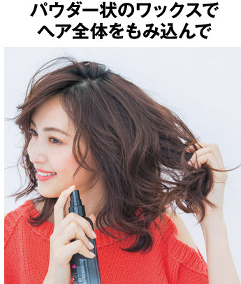 仕上げのこの一手間で、アレンジのもちは全然違います! まずは全体にしっかりと『少し多いかも?』と思うくらいかけて。前髪や顔周りなど、ニュアンスを残したい所にはさらに重ねづけを。