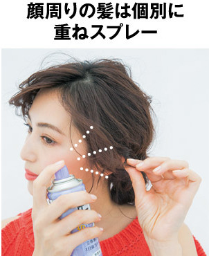 トップから毛先とまんべんなく。スプレーをかけた後は決して髪をほぐしたりしないこと! 後れ毛や顔周りのニュアンスもきちんと整えて完成形にしてからスプレーをかけて。