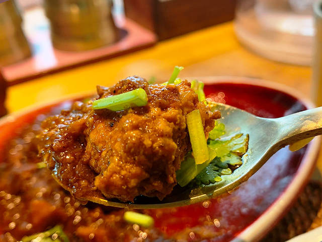 マイルドな味わいとともに驚かされるのが、鶏のやわらかさ。聞けば、築地の鶏の名店『鳥藤』の特選鶏もも肉を60℃の低温で数時間煮込み、一晩マリネし、注文後にさっと炙ってからカレーソースで軽く煮込んでいるそう。本場の南インドでも、こんな手の込んだやり方をしている店はないだろう。もはや、南インドのカレーを超えた唯一無二のカレーといえる。