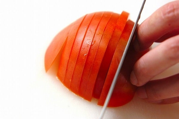 ・トマトはヘタをくり抜き、縦半分に切って厚さ5mmの半月切りにする。