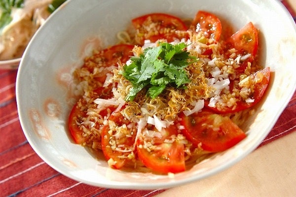 紫外線が気になりはじめたら、美肌効果が期待できる「トマトとジャコの冷やし中華」に決まりです。