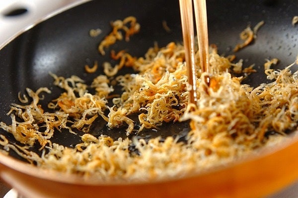 1、フライパンにゴマ油大さじ2を熱し、チリメンジャコがカリカリになるまで炒める。
