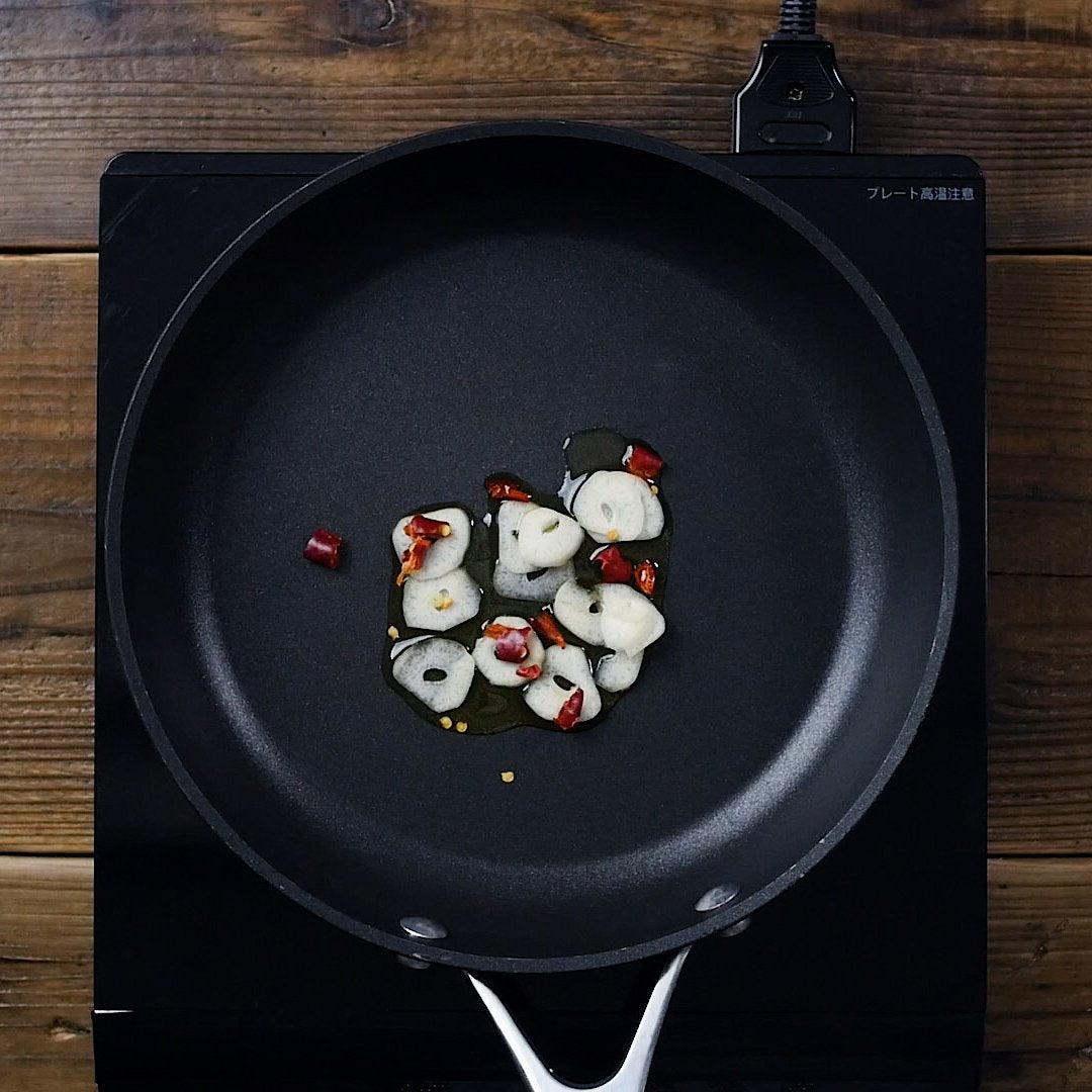 フライパンにオリーブオイルとにんにく、赤唐辛子をちぎって入れ、香りがするまで弱火で炒めます。