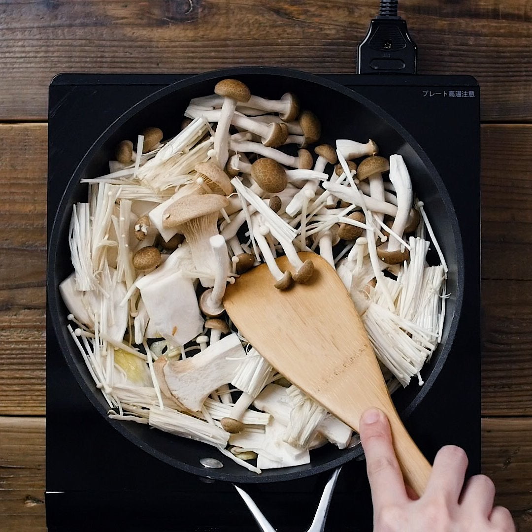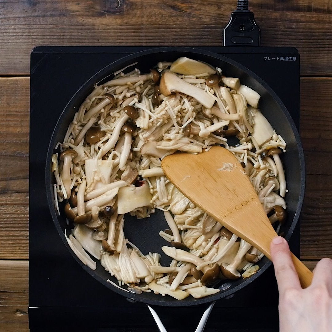 エリンギ、しめじ、えのきだけを加えて炒めます。