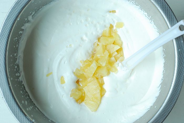 ⑤ 残り4枚のパイナップルをナイフで小さな角切りにします。クリームチーズのボウルに生クリームとパイナップルピューレ、角切りパイナップル、湯で溶いたゼラチンを加えその都度よく混ぜます。