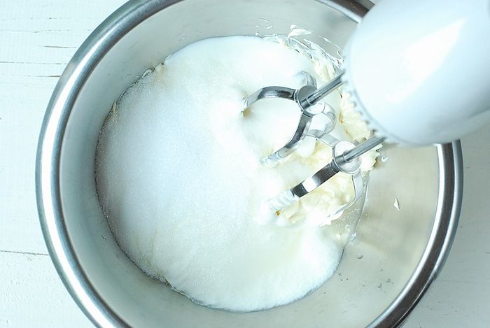 ③ クリームチーズを耐熱容器に入れレンジ600wで30秒加熱して柔らかくします。ボウルにクリームチーズとグラニュー糖を入れ泡立て器で柔らかく練ります。