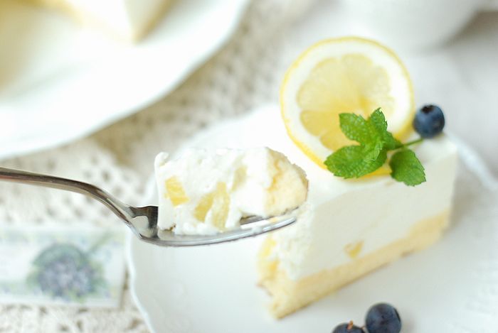 下に敷いたチーズケーキもふわふわでレアチーズとの相性も抜群です!ヨーグルトをたっぷり加えた爽やかなテイストは暑い日にもぴったり。