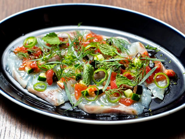 「シェフがイタリアで体験したことを、お客様にも楽しんでいただく」というのも、同店のコンセプトの一つ。前菜「カラブリア風鮮魚のカルパッチョ」(写真下)は、山口シェフが南イタリアで出逢った料理を、洗練されたスタイルで再現したものだ。