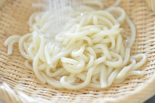 冷凍うどんは表示通りにレンジで温めて冷水でよく冷やして、ざる又は器に盛り付けます。