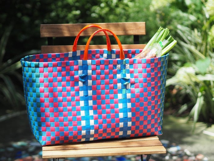 筆者が約1年前から愛用しているのは、こちらのカゴバッグ。ベトナム在住の友人からお土産でもらい、約1年ほど愛用しています。現地では安いところだと600円ほどで販売されているそうで、凝ったデザインのものでも1,000円しないのだとか。羨ましい……!段ボールをまとめるときに使われるPPバンド(ポリプロピレン)を編んで作られたかごは、とにかくカラフルでかわいいのが特徴。それだけではなく、エコバッグに最適な万能アイテムなんです。